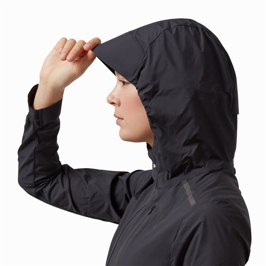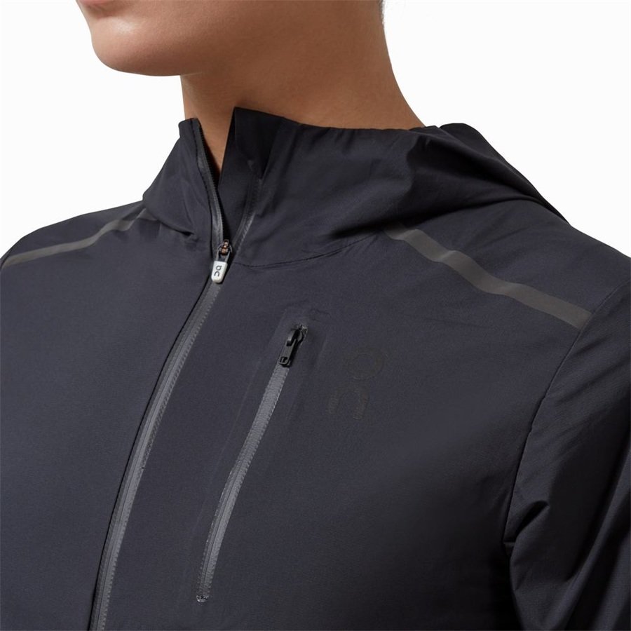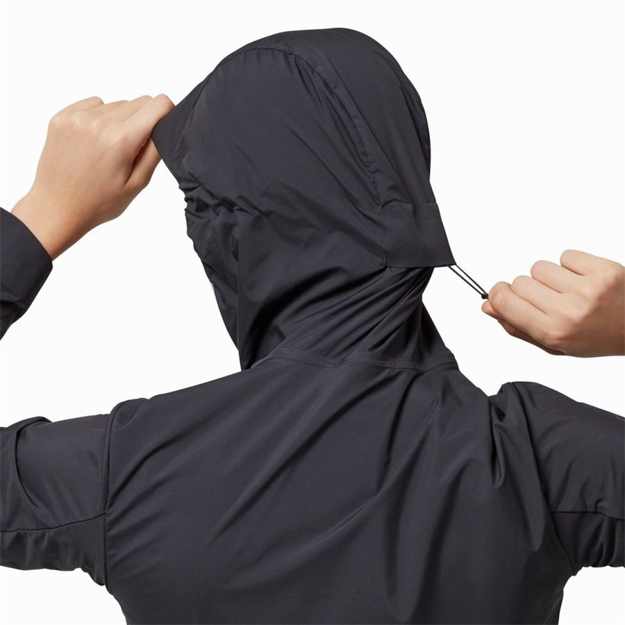 Every element of the Weather Jacket is made with the practicalities of running in the elements in mind.Like,the cap-design of the jacket's hood,which keeps it in place in the wet.The pockets of the Weather jacket offer water-resistant zip protection for your valuables.And the entire jacket folds quickly into its own breast pocket,allowing for ultra-small storage and portability.